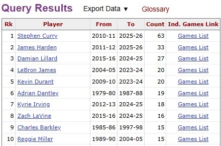 所有球员中最多的是库里,他一共63次做到这点。